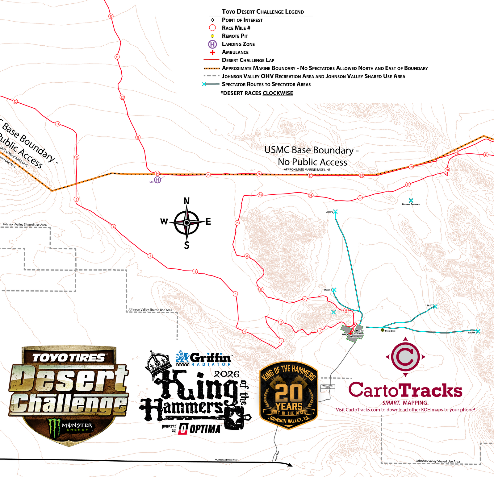 Cartotracks maps ONLY work with the Avenza Maps app. The 2026 KOH Desert Challenge course with race mile markers, lap identification, designated spectator areas, pits, rock trail names, topographic contours, and Hammertown location.