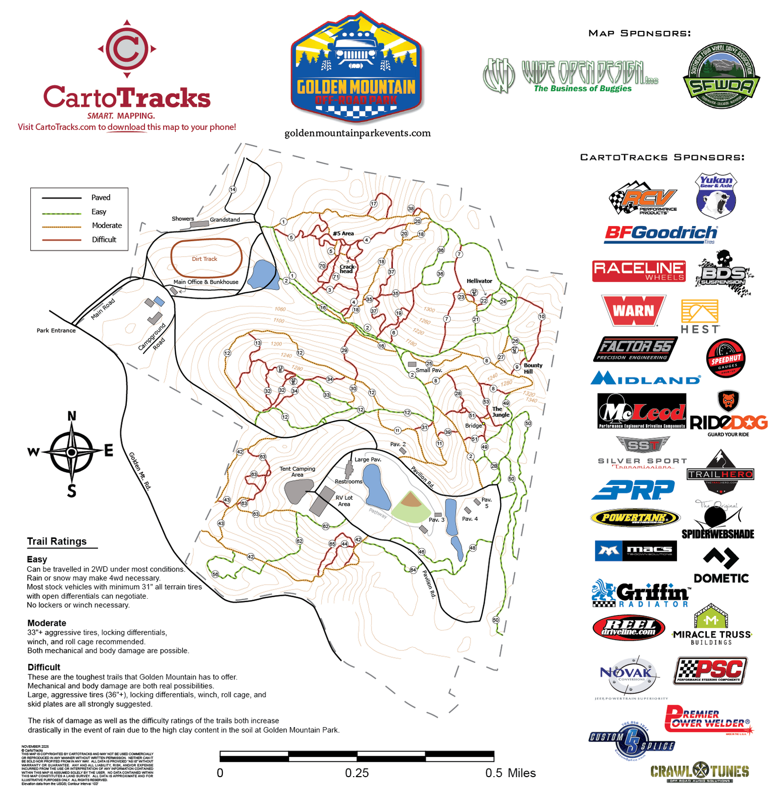 Golden Mountain ORP Map includes trails rated to park rating system, points of interest, obstacles, topographic contours, and property boundary. Map can only be used in the Avenza Maps app.